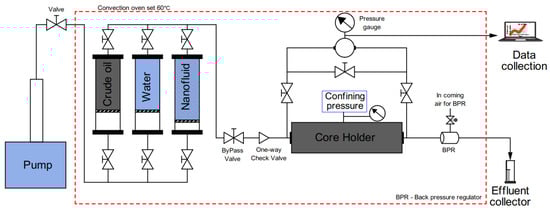 Oil displacement tests were carried out at the reservoir temperature (60 C) in aged core plugs to determine the EOR potential of silica based nanofluids. A schematic of the core flooding apparatus is shown in Figure 3. It is comprised of an injection pump, three tanks each containing crude oil, water and nanofluid. The reservoir tanks were assembled vertically inside an oven set at 60 C. A check valve and back pressure regulator (set to 5 bars) were used to prevent any back flow of produced fluids and keep the system pressure constant during the experiments. The core was loaded in the Hassler core-holder and oriented horizontally under confining pressure held within 18–22 bars. The crude oil was injected at low rate (0.02 mL/min) to eliminate any air bubbles, until the temperature in the reservoir stabilized at 60 C. To simulate oil production of a reservoir: (i) conventional water-flood was conducted at a constant reservoir flow rate, 0.2 mL/min, until there was no oil production for 1-pore volumes (PVs). Next, the flowrate was increased ten-fold (bump flood) for 1-PV in order to mitigate capillary end-effects, establish water flood residual oil saturation and ensure that any production would result from the injection of nanofluid. (ii) the injection was continued with nanofluids at the constant flow rate until there was no more oil production at core outlet for ≈3-PVs; likewise, the bump flood was applied for 1-PV. To study the behaviour of the injection fluid flow through the pores, two pressure sensors were connected at the entrance and exit of the core-holder; the differential pressure of the fluid across the core was recorded using a computer.