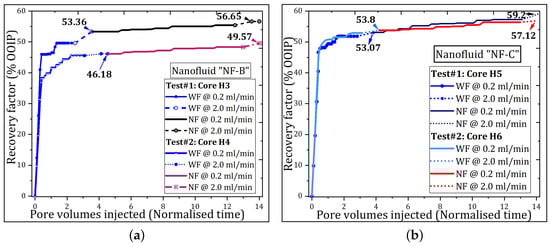 Effect of nanofluid injection on oil recovery during normal low rate and bump rate injections: (a) Sample NF-B: Test#1 the first oil production occurred ≈1.8 PVs and the RF ≈ 0.5% OOIP; Test#2 produced ≈ 0.5% OOIP at 1 PV. (b) Sample NF-C: Test #1 the oil production occurred at ≈2.2 PVs and the RF ≈ 2.3% OOIP; Test #2 the first production occurred at ≈1.3 PV and the RF ≈ 0.3% OOIP.
