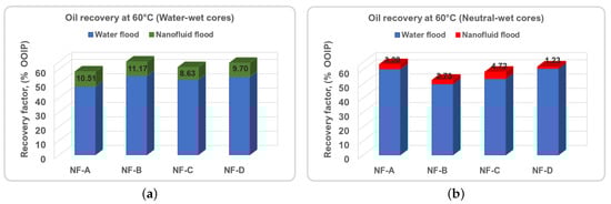 The temperature seemed to have minor influence on oil recovery in neutral-wet cores, unlike in water-wet cores. Figure 5 illustrates the average oil recoveries for comparison purposes obtained in water-wet and neutral-wet Berea cores conducted under similar procedure and conditions. Figure 5a shows the nanofluid flooding results in water-wet systems and were extracted from Bila et al. [16], while the current results are given by Figure 5b and were calculated from Table 5. Clearly, the results indicate a superior oil recovery behaviour in water-wet Berea sandstone with the injection polymer-coated silica NPs. This may be associated with entrapping phenomenon in both rock systems during water flooding stage. In water-wet rocks, water fills the smaller pores and retains a considerable amount of the oil in the larger pores after water flooding which is amenable to EOR process. In contrast, neutral-wet cores tend to recover considerable amount of oil, despite the early water breakthrough. In addition, oil is trapped in the smallest pores and the residual oil saturation would resist mobilisation.