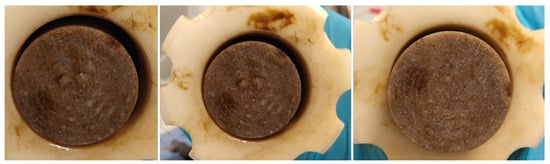 Aside from the temperature, the size of the nanoparticles seemed to influence the displacement efficiency; largely due to stability issues. Particularly, samples NF-C and NF-D with the largest particle size aggregated at core entrance during the EOR experiments. This resulted in physical filtration and the formation of nanoparticle “cake”, shown in Figure 6. This was also observed in our previous work [16] but with water-wet Berea core plugs. However, the resultant layer of NPs appeared noticeably thicker in water-wet rocks, resulting in higher displacement pressures than in neutral-wet rock systems. This may indicate that polymer-coated NPs are more effective in improving the fluidity of the particles through neutral-wet Berea pores than in water-wet Berea pores.