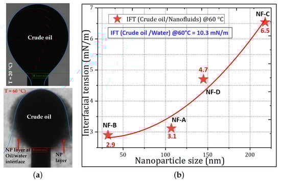 The IFT between crude oil and water, at 60 C, was 10.3 mN/m [16]; in the presence of NPs, IFT decreased to 6.5 to 2.9 mN/m. Furthermore, Figure 7b shows that the reduction is dependent on the size of the nanoparticles. The smallest NPs tend to exhibit a high affinity capacity to adsorb at the interface, coming into contact with a large surface area; consequently, the NPs had the largest IFT reduction compared to the larger particles. For example, the NF-B sample with the smallest size (32 nm) reduced the IFT by 71.8% compared to the 36.9% reduction by the largest NF-C sample. This can be associated with the increase in repulsive forces between the smallest NPs, resulting in a greater disjoining pressure between the two-phase molecules [38]. In addition, the IFT reduction can be due to the surface-active polymer molecules surrounding the surface of the NPs that provide steric repulsive forces and stabilization of the NPs suspension. Comparing the results of the IFT data from previous studies at room temperature [15,17], for the same NPs, the greatest IFT reduction is achieved at elevated temperature. This indicates that the wetting properties and the binding energy of the NPs to the oil/water interface increase with temperature. This has been attributed to the intensification of Brownian motion, which increases the particle collision and reduces intermolecular interactions between oil/water [26]. However, the displacement of oil at elevated temperature still has a multiple effect on IFT, the formation of aggregates/agglomerates of NPs, the loss of NPs at the interface and the inhibition of NPs from performing their designated surface functions at the interfaces and compete for poor performance of nanoparticles.