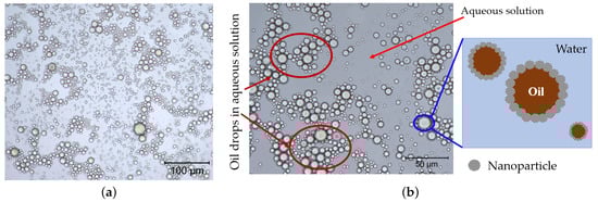 A reduction in interfacial tension can create favorable conditions for the generation and stabilization of emulsion during the process of oil recovery by nanofluids. This premise was studied by increasing injection flow rate at the end of low rate injection. High flow rate can provide an extra energy necessary to break up oil phase and allow for NPs to adsorb to the fluids interface [41], thus generating emulsions. The produced core flooding effluent was then visualised using a high-resolution microscopic camera; the magnified images of the flooding effluent are presented in Figure 8. The images illustrate oil drops dispersed in aqueous solution in the presence of nanoparticles, indicating that residual oil was produced as oil-in-water emulsions.