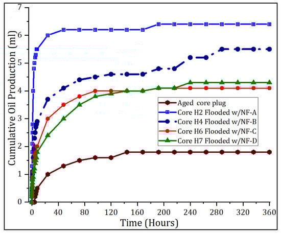 Nanoparticles target improving oil recovery by changing the surface roughness of the reservoir pores and thus altering its wettability to more water-wet state. The degree of water-wetness that can be achieved largely depend on how the NPs affect the crude oil/brine/rock properties [30]. Presently, we conducted spontaneous imbibition (SI) tests to evaluate such interactions induced by nanoparticles after nanofluid oil recovery experiments. In SI tests, the water will imbibe in the reservoir pores and displace the oil, if the reservoir is likely water-wet, as it has a positive capillary pressure [30]. The results of SI tests are presented in Figure 9. Prior to nano-EOR tests, the cores were aged 7 months in crude oil; post aged core wettability was evaluated by SI using one core plug. The lower curve, in Figure 9, shows the water imbibition performance in the aged core; there was no appreciable oil production before 10 days. Its Amott wettability index was −0.08, indicating neutral-wet condition. Additional cores aged under similar conditions were used for recovery tests, assuming that they retained the same neutral-wettability. After nanofluid core flood ceased production, the wettability alteration due to the adsorption of NPs was investigated. Figure 9 shows the cumulative oil production by water imbibition as a function of time. Depending on the particle size and particle retention in the pores, rock pore size distribution, etc., varied water imbibition profiles were achieved, but all showed an improved rate of water intake. That is, the water spontaneously invaded the rock pores and displaced the oil significantly, shortly after the placement of the core in the Amott cell. In contrast to the reference core where the oil production by water imbibition occurred from the tenth day, and reached stability 5 days later; thereafter, no oil production was observed. Part of the initial oil production of the aged core was the oil strongly attached to its surface after aging process. The jump in oil recovery, at 120 h, is because the cell was slightly shaken. In Figure 9, cores H2 and H4 were treated/injected with samples NF-A and NF-B, respectively. Its imbibition curves indicate superior oil recovery behavior by SI compared to other; this predicts the greater ability of the NPs to change oil-wet pores to water-wet state and increase oil recovery in a timely manner. It is worthy to mention that NF-A and NF-B had the smallest NP size and were stable throughout the duration of nanofluid flooding experiments. Therefore, with small size, NPs could contact most of the pore spaces to change its wettability.