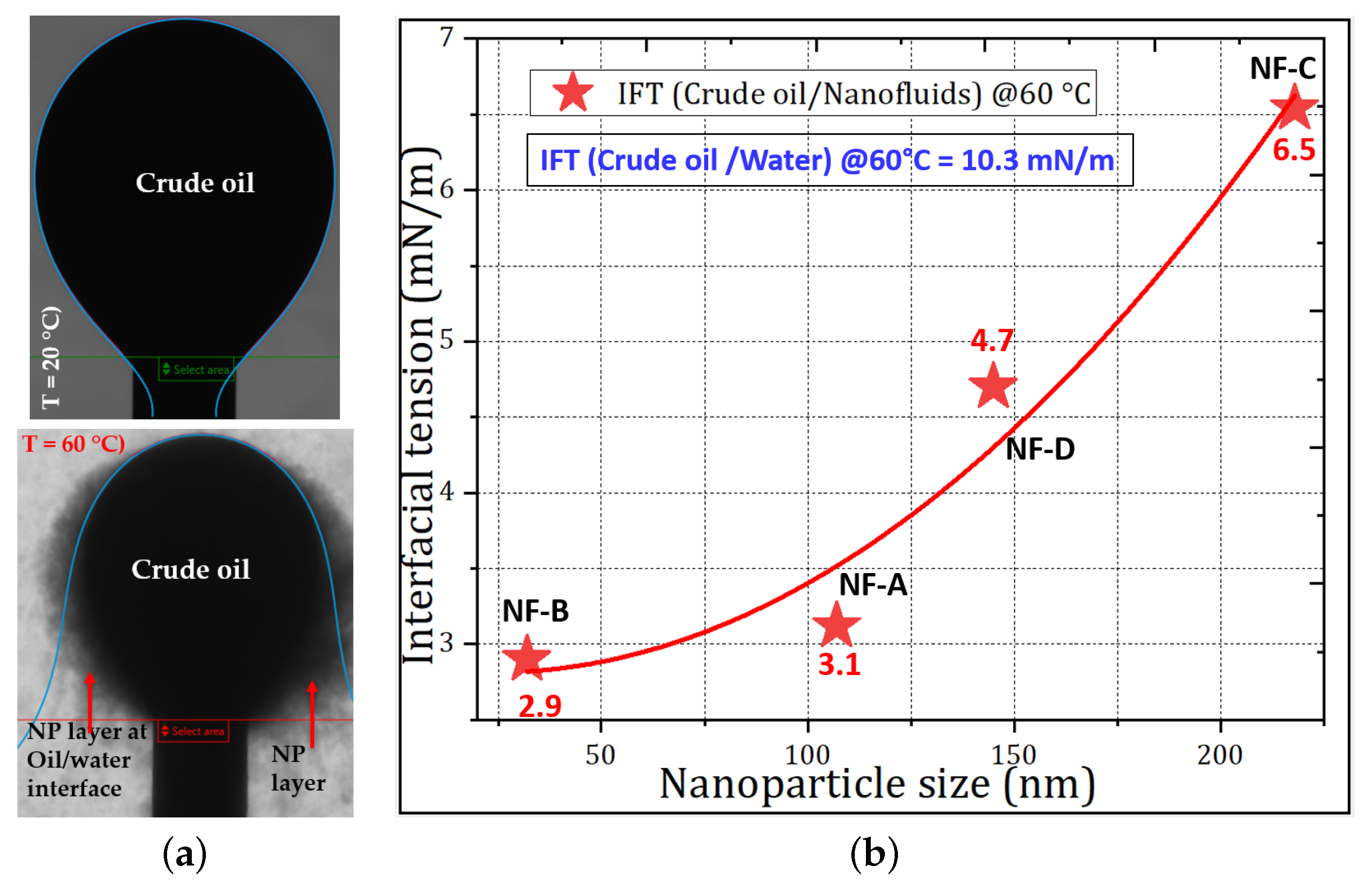 - The nanoparticles can reduce the oil/water interfacial tension at a concentration as low as 0.1 wt.%. The smallest nanoparticle size were more efficient in reducing the tension due to the large contact area;