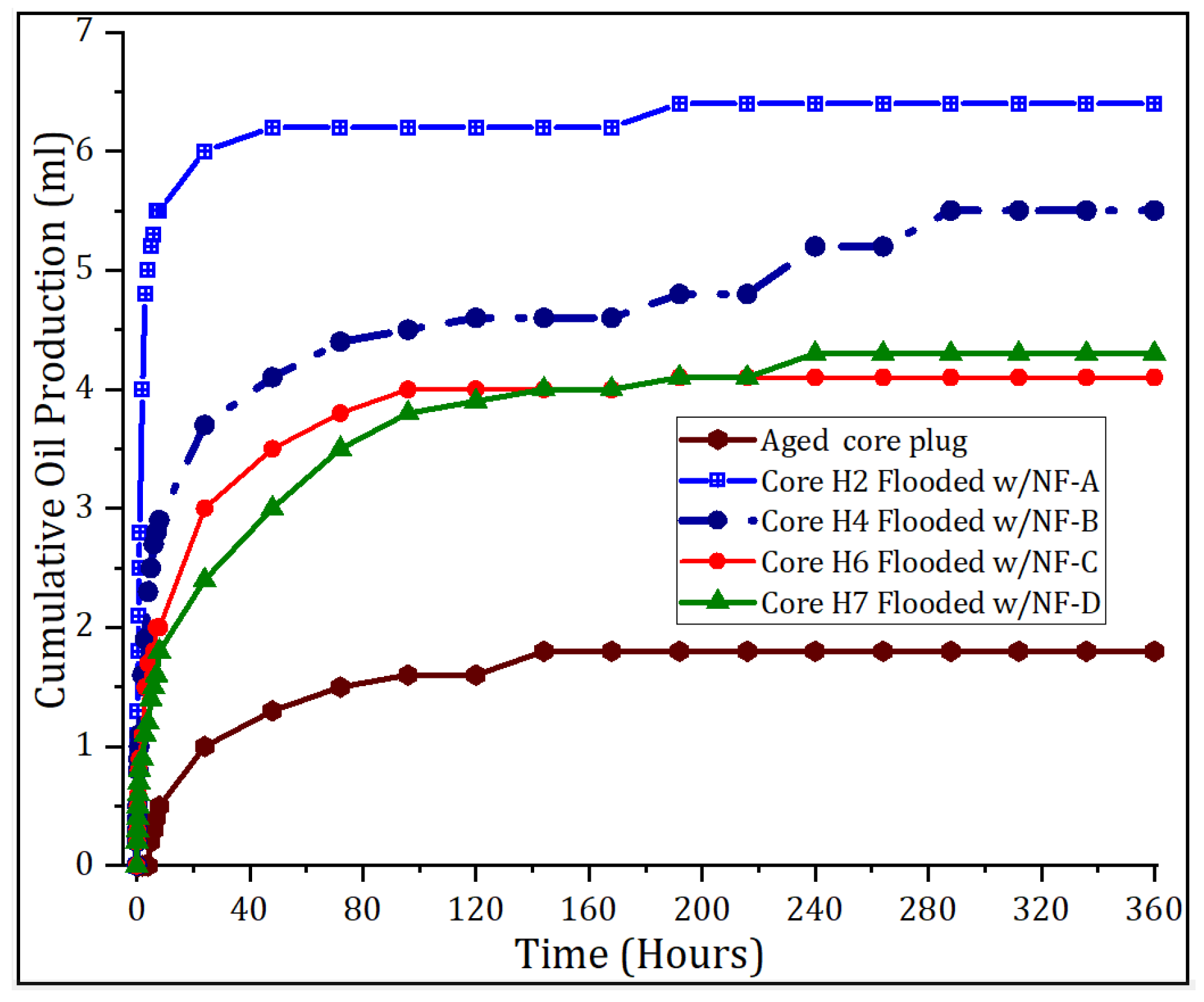 - The size of nanoparticles and the formation of large aggregates within the pores were observed to increase displacement pressure, resulting in poor oil recovery efficiency;