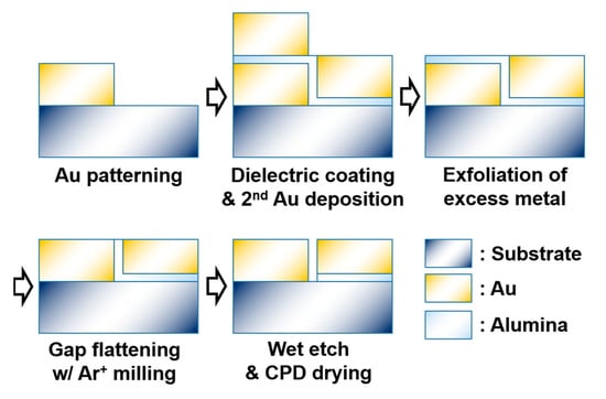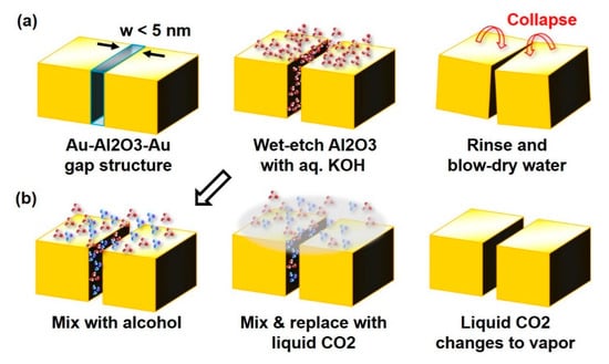 In this work, we demonstrate a means to overcome the issue and successfully fabricate metallic nano-trenches with gap widths as small as 1.5 nm. Here, we use the critical point drying (CPD) technique, whose working principle relies on replacing liquid water with liquid carbon dioxide (CO2) and vaporizing the CO2 at its critical point to minimize the force applied to a system in the drying process (Figure 1b). The CPD technique has been widely used in the field of biology and microelectromechanical systems (MEMS) for preventing capillary collapse of small structures including various microstructures [21,22,23,24] and freestanding thin films of semiconductors [25,26]. By applying this method to metallic nanostructures, we successfully fabricate 1.5-nm-wide metallic nano-trenches, which was unachievable with the conventional wet-etch and dry process.