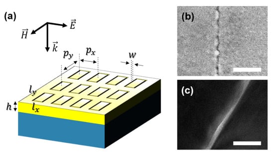 (a) Overview of the fabricated nano-trench array on Au film on a silicon substrate. In our sample, w = 1.5 nm, px = 20 μm, py = 50 μm, lx = 10 μm, ly = 40 μm, h = 250 nm. Polarization is perpendicular to the long side of the rectangular ring (ly). (b,c) Top-view SEM and cross-sectional TEM images of the metal–insulator–metal gap structure, respectively. Scale bar: (b) 50 nm; (c) 20 nm.