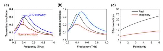 Figure 4b shows the theoretical spectra calculated with the coupled mode method [31,32], which have been successfully implemented in simulating nanostructures in long-wavelength regimes [33,34,35]. We modeled collapsing of the gap as an increase in imaginary permittivity of the gap material, i.e., an increase in conductivity, due to formation of metallic bridges in the gap. The results are in good agreement with the experimental data, supporting the validity of our analyses. It is worth noting that etching the alumina between the gap leads to an increase in amplitude as well, even though the absorption coefficient of alumina is negligible in THz frequencies. We attribute this to excitation of gap plasmon modes, which is a hybridization of two surface plasmon modes for the two closely placed metallic surfaces [36]. As the mode profile extends into the metal as well, ohmic losses from the metal may lead to an absorptive mode propagation even when the dielectric has no absorption [35]. Thus, both real and imaginary parts of effective indices decrease upon etching the dielectric, i.e., reduction in permittivity inside the gap, which is why we observed an increase in both the amplitude and frequency of the resonant mode of the nano-trenches upon the wet-etching (Figure 4c).