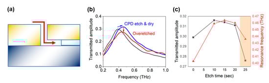 We also observed that the performance of the fabricated sample depends strongly on the etching time, i.e., the amount of time the sample stays in the wet etchant. This may be inferred from the fact that the alumina spacer exists not only between the metallic layers but also underneath one of the layers, which leads to a possible collapse of the nano-trenches upon complete etching of the underlying alumina layer (Figure 5a). Such a trend is observed in Figure 5b, where the transmission spectrum of an over-etched sample shows a drop in amplitude compared to a successfully etched sample, indicating formation of conducting channels like the case in Figure 4. The optimal etching time was found to be 10~20 s (Figure 5c); for etching times of 25 s or longer (not shown), both the resonance frequency and the transmitted amplitude decrease, indicating shrinkage and collapsing of the structure.