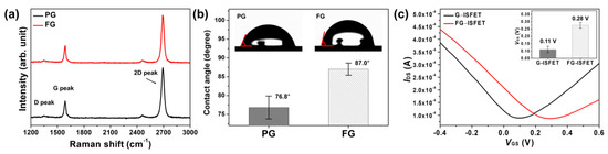 The characteristics of graphene before and after fluorobenzene treatment for 30 s: (a) Raman spectra; (b) water contact angles; and (c) IDS–VGS of G–ISFET and FG–ISFET.