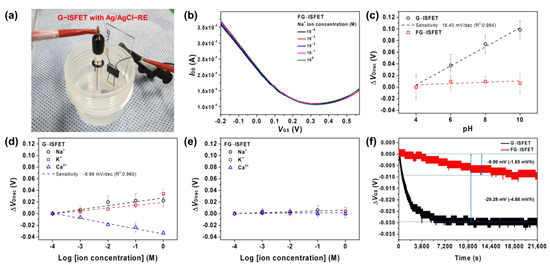 Evaluation of sensitivity of G–ISFET and FG–ISFET with Ag/AgCl–RE. Linear fits were used to extract sensitivity: (a) experimental setup using G–ISFET with Ag/AgCl–RE; (b) IDS–VGS of FG–ISFET depending on Na+ ion concentration; (c) pH sensitivity of G–ISFET and FG–ISFET; (d) Na+, K+, and Ca2+ sensitivity of G–ISFET; (e) Na+, K+, and Ca2+ sensitivity of FG–ISFET; and (f) long–term stability of G–ISFET and FG–ISFET in Tris–HCl buffer, in which 100 mM NaCl was dissolved for 6 h.
