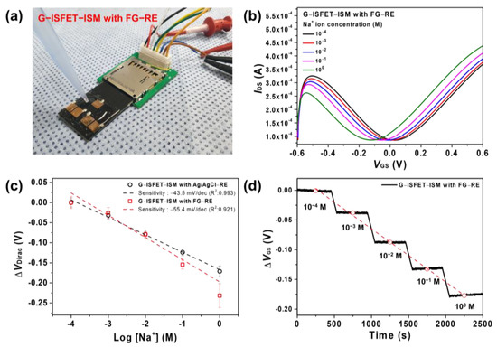 The gate channel of G–ISFET was covered with ISM and was employed to detect Na+ ions using Ag/AgCl–RE or FG–RE in Tris–HCl buffer solution. Figure 4a depicts G–ISFET–ISM with FG–RE in use during a typical experimental run. The sensing device had a 2D structure, and the testing solution was dropped onto the 2D sensing device using a micropipette. We showed the IDS–VDS characteristics of G–ISFET–ISM with Ag/AgCl or FG–RE. VDS was increased from 0.0 V to 0.05 V in a Tris–HCl buffer solution; IDS increased with respect to VGS at the n–channel region (Supplementary Figure S3). When gate voltage was applied by using FG–RE, ions in the electrolyte moved and formed electrical double layers on gate channel surface of G–ISFET–ISM and FG–RE. The electrical double layers had no charge transfer, and current flow through the electrolyte from the G–ISFET–ISM to the FG–RE was negligible (<0.1 nA). This indicates that the electrical double layers act as the thin insulators in both sides. However, when FG–RE was used at the same VGS voltage, the current value was smaller when Ag/AgCl–RE was used. The transconductance (gm) of G–ISFET–ISM was higher when Ag/AgCl–RE (0.3 mS) was used than when FG–RE (0.18 mS) was used.
