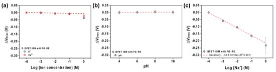 Normally, many kinds of ions in the body can be released through urine. The release of such ions depends on food intake and kidney health [30,41]. Therefore, we evaluated G–ISFET–ISM with FG–RE in the presence of interfering ions (H+, K+, and Ca2+). The evaluation of the sensitivity of G–ISFET–ISM with FG–RE to K+ and Ca2+ ions was performed using a Tris–HCl buffer solution, in which 100 mM NaCl was dissolved. The ∆VDirac values of G–ISFET–ISM were considerably lower for K+ and Ca2+ ions compared to those for Na+ ions, as shown in Figure 5a. Because the ISM selectively allows passage of Na+ ions through the membrane according to the selectivity coefficient, the interfering effects of K+ and Ca2+ greatly decrease in the presence of Na+ ions in the electrolyte [13,42]. The results of the evaluation of G–ISFET–ISM with Ag/AgCl–RE with regards to interfering ions are shown in Supplementary Figure S5. Figure 5b shows the sensitivity of G–ISFET–ISM with FG–RE to pH. As shown in Figure 2c, G–ISFET exhibited sensitivity to pH, due to the oxygen functional groups on the graphene channel surface [22,43]. However, G–ISFET–ISM did not exhibit sensitivity to pH. The gate channel surface of G–ISFET–ISM that was exposed to the buffer solution was covered by the ISM; thus, the oxygen functional groups did not react with H+.