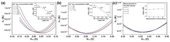 where VISM is the Na+ ion sensitivity of the ISM gate channel, Vs is the potential of the source electrode, VFNa+ is the Na+ ion sensitivity of FG–RE, and VF is the bias potential of FG–RE. The Na+ ions sensitivity of G–ISFET–ISM is determined by the differential response between the ISM gate channel (VISM) and FG–RE (VFNa+). The IDS–VDS characteristics of G–IGFET–ISM with FG–RE in the Tris–HCl buffer solution, where VGS was fixed at 0.5 V and VDS ranged from 0.0 V to 0.05 V, are shown in the Supplementary Figure S3b. IDS was increased depending on the Na+ ion concentration in electrolyte solution. This was consistent with the VDirac value shifting to the left as the Na+ ion concentration increased, as shown in Figure 4b.