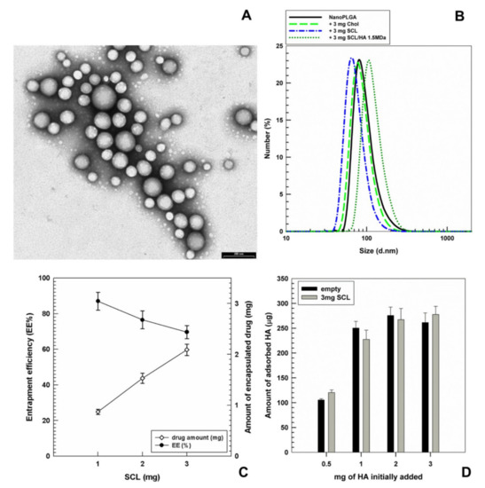 (A) TEM micrograph of PLGA nanoparticles prepared by using 3 mg of sclareol (SCL); bar = 200 nm. (B) Mean sizes of PLGA nanoparticles prepared by using 3 mg of cholesterol (Chol) or sclareol (SCL) and then coated with hyaluronic acid (HA). (C) Entrapment efficiency of SCL as a function of the amount of active compound used during the preparation of PLGA nanoparticles. (D) Evaluation of the amount of HA adsorbed on the surface of PLGA nanoparticles prepared with 3 mg of SCL as a function of the amount of polysaccharide used. Reprinted with permission from [7]. Copyright ©2019 Elsevier Ltd.