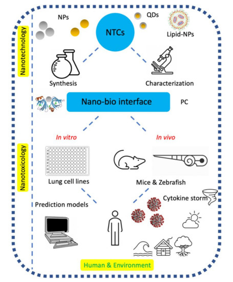 To provide elucidative clues on the nebulous toxicity of NPs and the correlation between their size and the elicited toxicity, the nanotoxicology community should develop a roadmap for standardized and harmonized toxicological testing procedures and methods for NPs [57]. Defining the affinity, stoichiometry, kinetics, and concentrations of NPs is a must for predicting their specific interactions with proteins to efficiently administer anti-coronavirus NPs in delivery systems. The dilemma remains in describing the contribution of PCs to ultimate distribution of such nanosystems in vivo [53]. Computational models using standard languages could also serve the prediction of NP toxicities [57] and help understand the impact of PC structure and fingerprints (protein patterns of NPs characterizing their PC) on cellular uptake and toxicity [52]. Development of research monitoring for airborne NP exposure (i.e., aerosol samplers in workplaces and environments), detectors for waterborne NPs, and sensors for measuring both exposure and potential hazards (e.g., production of reactive oxygen species) under different circumstances could robustly contribute to unveiling the impact of NPs on humans and the environment [43].