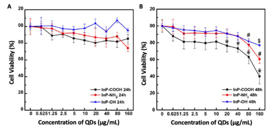 Cell viabilities of RLE-6TN cells after treatment with quantum dots (QDs). Namely, InP/ZnS-COOH, InP/ZnS-NH2, and InP/ZnS-OH QDs for 24 (A) and 48 h (B). Adapted from [69] under the terms of the Creative Commons Attribution License (CC BY); Frontiers Media SA, 2018.