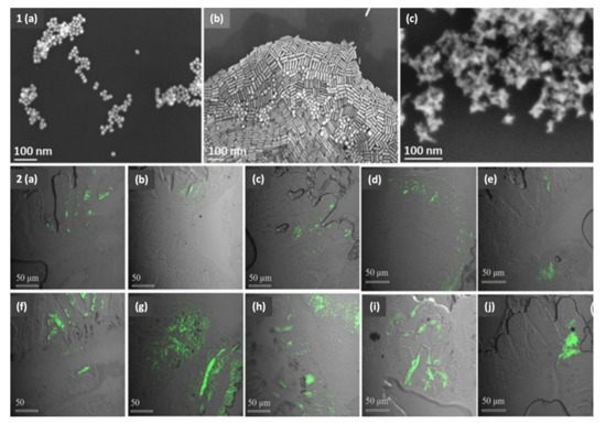 SEM images (1) of different shapes of Au NPs. Namely, spherical Au NPs (a), rod Au NPs (b), and star Au NPs (c). Confocal images (2) of zebrafish digestive system after injection with Fluorescein-conjugated glyco-Au NPs after different time points. Namely, spherical Au NPs after 4 h (a,f) (with slightly different sizes); rod Au NPs after 4 h (b,g) (with slightly different sizes), 24 h (d), and 48 h (e); and star Au NPs after 4 h (c,h) (with slightly different sizes), 24 h (i), and 48 h (j). Reproduced from [81] under the terms of the Creative Commons Attribution 4.0 License with modifications; Springer Nature Limited, 2017.
