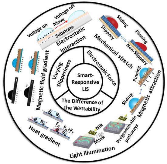 In general, approaches of droplet manipulation on smart LISs include varying slipperiness, electrostatic interactions, the difference of the wettability and other means, which have been reported in recent works. Details of these works are presented in Table 1 and they will be discussed in the following sections.