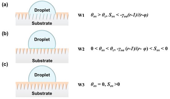 When the surface energy of the substrate is high, the lubricant immobilized by the substrate is completely replaced by the droplet (W1 in Figure 2). This results in high friction between the droplet and the LIS []. With the surface energy of the substrate decreasing, the droplet only replaces the outer lubricant layer rather than the lubricant inside pores. (W2 in Figure 2). When the surface energy of the substrate is low enough, protrusions are covered with a lubricant layer, which cannot be replaced by the droplet (W3 in Figure 2). This can significantly decline the friction. Thus, the droplet is prone to sliding on an overcoated smooth lubricant layer at a low sliding angle.