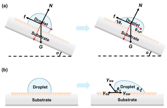 where ρ, V, g, and α represent the density, volume of the liquid droplet, gravitational acceleration, and the tilted angle, respectively. For a given tilted surface, the droplet motion’s driving force remains constant, as shown in Figure 3a. However, applying stimuli enables the control of droplet movement by changing the friction (f). This friction (f) during sliding can be calculated as: