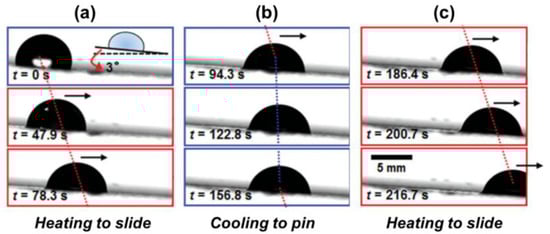 Demonstration of thermo-controllable drop sliding motion. (a) The LIS was heated to motivate the droplet sliding. (b) The droplet was pinned after removing the heat source. (c) The droplet continued to slide. Reprinted with permission from []. Copyright (2014) Wiley-VCH.