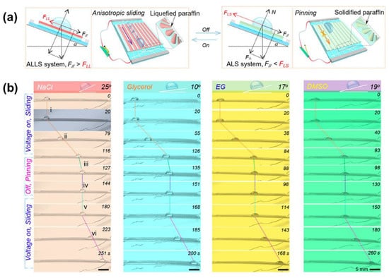 Furthermore, the use of hybrid lubricant (a mixture of solid and liquid paraffin) can also achieve an ultra-low-voltage response and shorten response time []. Chen et al. demonstrated that a 5-V joule heating generated from a nanowire heater could liquefy above paraffin within 20 s forming a dynamic slippery surface, and afterward, the droplet starts to move (Figure 5a). Additionally, the voltage to melt the lubricant can be lowered to 2 V by tuning the liquid paraffin ratio. Because this hybrid paraffin has merits of good biocompatibility and low surface energy, this type of LIS not only can be used for intentional transport of nonconductive biological or conductive ionic droplets (NaCl) but also diverse organic droplets manipulation (e.g., glycerol, ethylene glycol, dimethyl sulfoxide), as shown in Figure 5b. Theoretically, the nanowire heater can be integrated with various patterned substrates, demonstrating adaption to various materials.