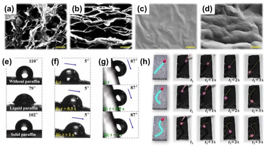 SEM (a) and cross-section (b) of a graphene sponge film; SEM (c) and cross-section (d) of a paraffin-infused graphene film. (e) Water contact angles of the porous graphene sponge film, the paraffin-infused graphene film in the presence and absence of radiation, respectively. (f) Demonstration of the droplet sliding on the paraffin-infused graphene film under the radiation of laser. (g) Demonstration of the droplet sliding on the paraffin-infused porous graphene film in the absence of the radiation. (h) Demonstration of the droplet sliding on a predefined route. The scale bar is 10 μm. From []. Reprinted with permission from AAAS.