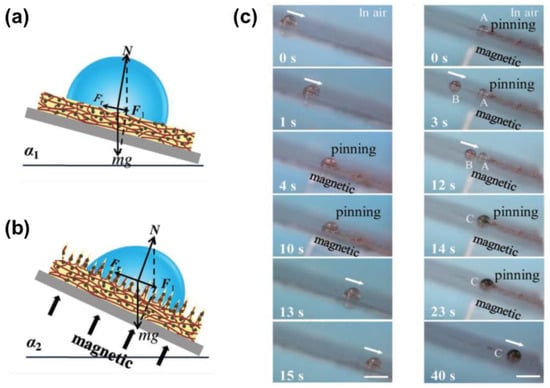 Like the light stimuli, magnetic stimuli are also attractive to achieve real-time wettability control because of the remote operability, rapid response, and high maneuverability. Compared with the thermal-induced controllable phase transition of lubricant, magnetic-stimuli LIS can instantly manipulate droplet motion without any delay. One of the facile ways to realize the magnetic droplet control is to embed the magnetic particles into the soft substrate of LIS. In the presence of a magnetic field, magnetic particles (e.g., Fe, Fe3O4, cobalt) inside the soft substrate are attracted to form protrusions, which promotes surface friction, as shown in Figure 7a,b. The formation of the protrusions enables the transition of the surface from slippery to rough. As a commonly used elastomer, PDMS has become one of the best candidates to encapsulate the magnetic particles due to its inert, non-toxic, good biocompatibility properties. Guo et al. presented a magneto-controllable droplet on slippery gel surfaces, which were fabricated by integrating magnetically responsive Fe/PDMS gel films with silicone oil []. It is found that increasing the intensity of the magnetic field can lower the sliding angle and enhance hydrophobicity. Transportation and merging of the droplets for a microreactor were also demonstrated via a chromogenic reaction shown in Figure 7c. The yellow FeCl3 droplet gradually slides towards the colorless pyrocatechol on the tilted LIS. Once the two droplets start to contact, the magnetic field is loading for 9 s to ensure a sufficient reaction time, and the droplet turns dark. Removing the magnet allows the dark droplet to slide off the surface due to the inherent self-cleaning property of LIS. Notably, the slippery gel surface showed superior air stability after 100 cycles due to the molecule-level dispersion of silicone oil in the PDMS network [].
