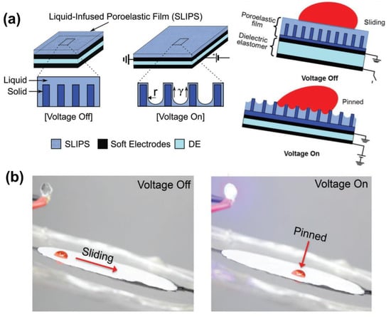 (a) Schematic illustration of electric-stimuli LIS and the droplet control mechanism. This smart LIS is integrated with the soft electrodes-sandwiched dielectric elastomer. The droplet initially slides on the tilted LIS in the presence of the lubricant layer when voltage is off. However, after applying a voltage, the poroelastic polypropylene is electrically stretched to reduce the pressure inside the pores, so the lubricant layer disappears and thereby, the droplet directly contacts the protrusions which leads to the droplet pinning. (b) Demonstration of the control of the mobility of a 50 µL droplet on a dynamic silicone-oil-infused polypropylene porous film tilted at 7° by loading/unloading 12 kV voltage. Reproduced with permission []. Copyright 2018, Wiley-VCH.
