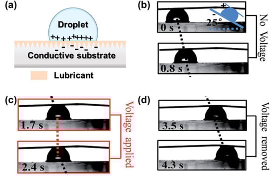 Utilizing electrostatic interactions between the substrate and the droplets also allows the control of droplet sliding and pinning behavior. Such type of electric-stimuli LIS requires a conductive droplet and conductive substrate working as the medium, a dielectric layer (lubricant layer) as a capacitance between the droplet and substrate []. Metal and alloys, carbon materials (e.g., graphene oxide, carbon nanotubes), and conductive polymers (e.g., polypyrrole) have been used for conductive substrates. Still, substrates with low conductivity (semiconductor and isolator) are also applicable after modification by conductive substances, such as Ag or indium tin oxide (ITO). As shown in Figure 9a, after applying a voltage, the conductive substrate and droplet generate opposite charges, enabling the electrostatic force to enhance the friction. Heng et al. explored the droplet motion on tilted conductive polymer-based LIS []. They found that by applying a voltage, the droplet is pinned, and removing the voltage allows the droplet to slide, driven by gravity (Figure 9b–d). Physical properties (e.g., conductivity, viscosity, thickness) of the lubricant layer and the type of droplet also play an essential role in the electrostatic force between the lubricant and droplets [,]. Using a high conductivity lubricant (e.g., ionic liquid) can generate a high charge density and an enhanced interaction compared to a nonconductive lubricant (e.g., silicone oil).