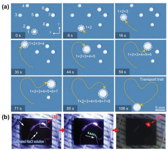 One solution is to create a temperature gradient by taking advantage of the synergistic effect of Young’s force (FY) and Marangoni force (FM). When doping photothermal particles into the LIS, the temperature rises in the irradiated region and the surface tension decreases. A localized dynamic temperature gradient causes the surface tension difference and the Marangoni force between the irradiated side and the other side of the droplet, which induces the droplet movement towards the unirradiated side (Figure 10a). For example, a photothermal-responsive organogel surface was developed for droplet control based on the temperature gradient. This organogel-based LIS is achieved by embedding Fe3O4 nanoparticles in PDMS, followed by silicone oil infusion. Figure 10b shows the local change in temperature at the droplet when irradiated. The synergistic effect of FY and FM provides a powerful driving force so that a 7 µL water droplet can move on the LIS tilted at a 10° angle against the slope. A droplet can be moved towards arbitrary directions in the presence of a unilateral NIR stimulus (Figure 11a). The droplet marked as No.1 was manipulated to slide and sequentially merged with other droplets. Moreover, the conductive NaCl droplet was also driven to turn on the disconnected circuit, enabling the diode to emit a red light (Figure 11b) []. More recently, Wu et al. further investigated the impact of lubricant viscosity, surface tension, and Fe3O4 content on FY and sliding velocity. Young’s force (FY) is enhanced with the increase of the droplet’s surface tension and amount of doped Fe3O4. However, increasing the lubricant viscosity lowers the FY, leading to a decreased sliding velocity []. To effectively generate the photothermal effect, the use of long-wavelength near-infrared light with strong penetration is necessary to irradiate the particles inside the substrate. The limitation lies in that only a few photothermal particles, such as graphene and Fe3O4, can respond to near-infrared light irradiation.