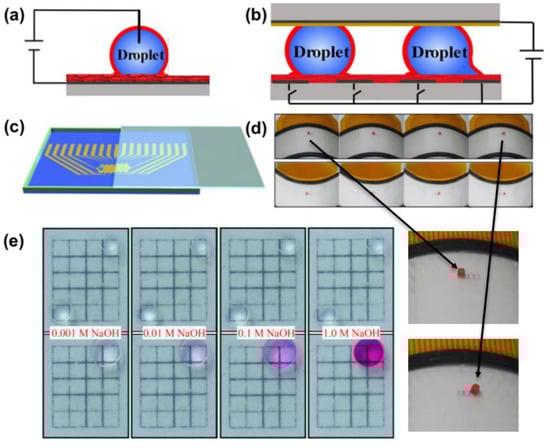 where θ0 (°), θv (°) correspond to the contact angle before and after applying the voltage U (V), γ (N⋅m−1) is the interfacial tension between the conductive droplet and surrounding medium, ε, ε0 and d (m) refer to the dielectric constant, the permittivity of vacuum (8.85 × 10−12 F⋅m−1), and the thickness of a dielectric layer, respectively. Thus, the resulting force difference between the two sides of the droplet can induce the droplet movement in the direction towards which the contact angle decreases []. Cao et al. used this method to move a droplet of NaOH towards another phenolphthalein droplet (Figure 12e). With the assistance of applied voltage (350 V), a 1.0 μL drop of NaOH aqueous solution with the concentration of 0.001, 0.01, 0.1, 1 M, was gradually actuated to merge with phenolphthalein (0.5 wt %) and finally, the merged large droplet turned pink. Figure 12d shows a red droplet (1.0 μL) manipulation on both convex and concave surfaces. This indicates this surface can potentially serve as a highly flexible and reliable microfluidic device for droplet manipulation. Electric-stimuli-responsive smart LIS is a promising candidate to control droplet motion. It is worth mentioning that to pin the droplet requires a certain high voltage. However, applying excessive voltage can break through the insulating lubricant layer, which results in the failure of droplet control. Additionally, both the droplet and substrate need to be conductive, limiting the scope of application of this technique.