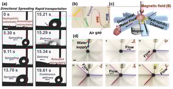 Liu et al. found when a droplet is injected on the surface, and it spontaneously moves towards the opposite direction of the tilted microcilia (Figure 13a) []. The water sliding direction can be instantly guided by adjusting the direction of the microcilia tilt. The direction of the microcilia tilt can be controlled by magnetic field direction. Based on this phenomenon, a device for droplet transportation was designed, as shown in Figure 13b. A water droplet located on the hydrophilic–hydrophobic boundary can be directionally transported and continuously guided into the hydrophilic channel. Different colored water flows can be separated and directionally transported to the desired channel by altering the magnetic field direction, demonstrating a real time, controllable, and unidirectional water delivery in a specific direction (Figure 13c). The driving force to motivate water droplets in this work relies on LIS’s difference and filter paper’s wettability, so an external hydrophilic surface is needed to assist the droplet transportation.
