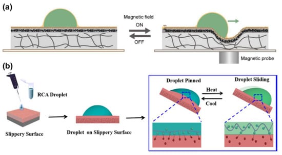 (a) Mechanism of the slippery surface to drive droplets by a magnet probe. Reproduced with permission []. Copyright 2019, Wiley-VCH. (b) Thermally control RCA biological droplet sliding behavior on the LIS. Reprinted with permission from []. Copyright (2019) American Chemical Society.