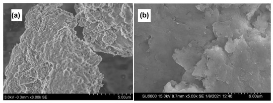 SEM technique is used to obtain information on the surface topography of prepared nanocomposites. As seen in Figure 5a,b SEM images show that the plate-like layered structure of MMT continues to remain even after the formation of the composite which facilitates the controlled release behavior of active ingredients present in the nanocomposite. Furthermore, no accumulations of CMC could be seen, confirming the relative uniformity of the spray coats.