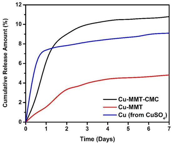 Cumulative release of Cu2+ from Cu−MMT−CMC 5.0 g/L, Cu−MMT, and CuSO4.5H2O.