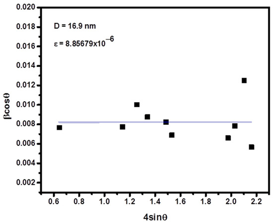 For comparison and better understanding, crystallite size was also calculated by William–Hall (WH) method. The crystallite size (D) and microstrain contribute to the line broadening in X-ray diffraction. William–Hall (WH) proposed a relation between crystallite size (D) and strain (ε) induced broadening as given by Equation (2) [35,37].