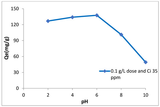 The adsorption of arsenic is greatly affected by the pH of the solution [4]. As is clear from Figure 5, adsorption of As (III) is higher and more effective in the range of pH 4–8. The maximum adsorption was found to be 137.6 mg/g at pH around 6. Thus we can say that adsorption is pH dependent and reduces abruptly as pH reaches 8–9. This phenomenon is found in accordance with several past studies carried out on the adsorption of arsenic on several iron oxides [3,48]. The mechanism behind As (III) removal is mainly adsorption and co-precipitation of arsenic with metal hydroxides such as iron and magnesium [1,49]. Adsorption of acid anions by oxides and hydroxides of metal usually declines as pH becomes highly basic [50]. It signifies that the prepared nanomaterial had a high reactivity at pH around 6. Moreover, at a lower pH (lower than pH of pzc), the nano-adsorbent surface will have additionally positive charges. However, arsenate comprising of H2AsO4− and HAsO42− are the dominant negatively charged arsenic species present in the form of in the acidic medium. Thus, enhanced arsenic removal by synthesized iron magnesium binary oxide nanomaterial at lower pH shows affinity between the positively charged surface of nanomaterial and the negatively charged species of arsenic.