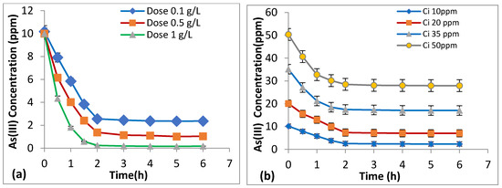 The influence of dosage and initial metal concentration on As (III) adsorption with time was studied on changing the adsorbent dosages from 0.1 to 1 g/L and initial concentrations from 10–50 mg/L. Figure 6a,b gives the decrease in arsenic concentration by varying dosage and initial concentration with time. The equilibrium was achieved around 3 h in this case. From the graph (Figure 6), the sharp fall in peaks clearly indicates that the uptake capacity of the adsorbent reduces with time as the available sites for adsorption get exhausted after 3 h duration of reaction time. Adsorbent dosage greatly affects the adsorption of arsenic because of an overall increase in surface area of prepared binary oxide nanoparticles, due to higher availability of binding sites which is in accordance with several past studies [56].