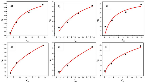 Nonlinear models of Langmuir adsorption isotherm at dosages (a) 0.1 g/L, (b) 0.5 g/L, (c) 1.0 g/L and Freundlich adsorption isotherm at (d) 0.1 g/L, (e) 0.5 g/L, (f) 1.0 g/L.