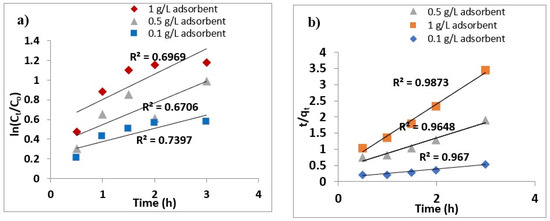 (a) Pseudo-first-order kinetics fitting, (b) pseudo second order kinetics fitting for 50 mg/L initial concentration of As (III) and adsorbent dosages 0.1, 0.5 and 1 g/L.