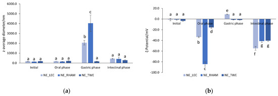 All NEs were shown to be stable at the oral phase; however, only NE_TWE maintained its stability at the gastric and intestinal phases since the value of particle size remained close to the one observed before the digestion process—see Figure 2a—although an increase in the PDI value was observed at the intestinal phase (results not shown). NE_RHAM presented the highest particle size increase at the gastric phase, from 155.5 ± 6.4 nm to 4041.1 ± 832.8 nm (p < 0.05)—see Figure 2a—and the highest increase in the PDI values (from 0.285 ± 0.040 to 0.969 ± 0.058). NE_LEC also presented a particle size increase from 184.1 ± 1.71 nm to 2063.3 ± 235.09 nm (p < 0.05) and an increase in the PDI from 0.246 ± 0.014 to 0.880 ± 0.097. However, at the intestinal phase, NE_LEC and NE_RHAM showed a decrease in particle size to values close to the ones observed at the initial stage, although with higher PDI values (0.539 ± 0.177 and 0.629 ± 0.110, respectively).