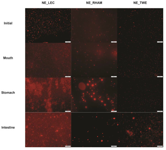 Figure 3 shows that NE_RHAM displayed some coalescence at the gastric phase, whereas NE_LEC showed some flocculation and NE_TWE maintained a particle size close to the values observed at the initial phase.