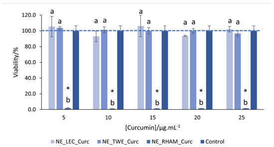 Effect of curcumin-loaded nanoemulsions (NEs) produced with different emulsifiers (lecithin (LEC), rhamnolipids (RHAMs), and Tween® 80 (TWE)) on viability of Caco-2 cells. Error bars represent the standard deviation of n = 3 replications. a–b Different letters indicate a statistically significant difference between NE/concentration interactions (p < 0.05). *Asterisks indicate statistically significant differences relative to the control group (p < 0.05).
