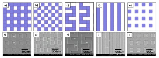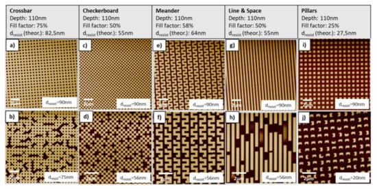 In order to study the filling properties based on the available imprint resist material, viscosity, and flow behavior, an e-beam written and etched silicon master was used. On this master, several arrays with different structure geometries as described in Figure 4a–e are present. The pattern investigated pattern sizes were 300 nm with a depth of approximately 110 nm have been replicated by SmartNIL and according SEM images are shown in Figure 4f–j.