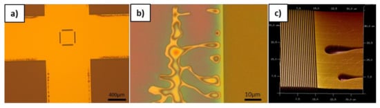 As in the above study, a lateral redistribution of the resist was observed within the pattern area, it was also of interest to investigate impact on the surrounding area. Therefore, a master with 400 nm L/S pattern with fields separated by about 1 mm non-patterned area was chosen. Within the pattern area, there is a uniform 50% fill factor but at the border there is a change of the fill factor to 100%. It is considered that in this area, the lateral flow of the resist is not hindered by the pattern and thus shows approximately the free path length of the resist redistribution. As it can be observed in the optical microscope images in Figure 9a and according to the detail picture in Figure 9b, there is a large lateral redistribution of the resist. While the dark areas with the L/S pattern are homogenously filled, it can be clearly seen that at the border of these structures in the non-patterned bright area large defects occurred. In the detailed image in Figure 9b, it is clearly observable that there is a redistribution of the resist within a range of several tens of micrometers. The AFM image in Figure 9c confirms this redistribution while showing defect areas next to the completely filled L/S patterns. Interestingly, the shape of the defects is comparable to an elongated droplet like structure. Generally, the shape and the distance of the defects show some unexpected behavior. There are no defects directly at the border, but some are present in the border vicinity. However, the largest defects are just a few tens of micrometers away from the patterned area. This is yet unclear and might be intermixed with other effects not only based on the lateral redistribution of the resist to fill the patterned area. However, it could be proven that in non-patterned areas there is a long-range effect on the filling of the structures. This also implies that the lateral flow of the resist will also be for patterned areas will be on longer range until the required resist volume is consumed.