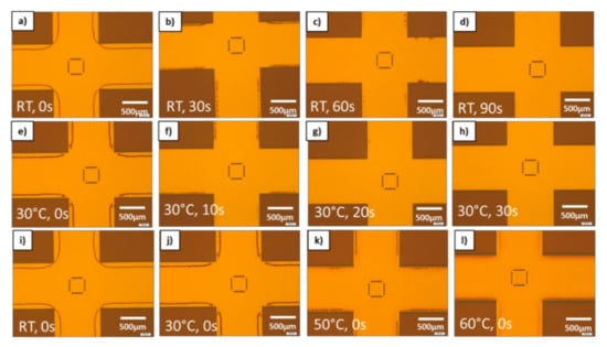 Obviously, it is not desired to have such defects in areas without patterns as well and thus it requires process optimizations to overcome this issue. As it is indicated that this is again strongly related to the fluidic properties, two key process parameters have been investigated on its effect on the border defects. As there are no structures where the defects occur it is obvious the capillary forces of the nanostructures are dominantly gaining material from this area. Even though there is enough material available in the unpatterned area, the defects are not compensated immediately if there is no delay time between full contact and UV exposure. For this process conditions, the defect area is well pronounced all around the edge zones of the patterns in a distinct distance from the L/S structure as depicted in Figure 10a. Adding delay time allows the material to redistribute better and to close the defects. It is easily observable in Figure 10a–d that the defects are vanishing more and more with increasing delay time from 30 s–90 s. At delay time of 90 s the defected zone is completely gone, showing that this effect is clearly related fluidic properties of the material. In Figure 10e–h it could be shown that by increasing the temperature to 30 °C the filling times could be reduced significantly. This is indicating the expected viscosity change of the resist at elevated temperatures. Thus, in a third test series, the viscosity of the resist was further lowered by increasing the temperature systematically without adding delay time. For all temperature dependent tests, a heated chuck was used, which can reach temperatures up to 60 °C. In Figure 10i,l,h, it is shown that increased temperature has a comparable influence as the delay time. The defects are strongly reduced by lowering the viscosity and fully vanished at 60 °C. This clearly proves that the resist redistribution is strongly liked to given filling and resist viscosity.