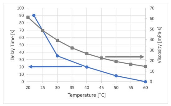 The dependence between delay time and imprint temperature is plotted in Figure 11 showing all series that have been investigated. The blue data series shows the time needed to have ideal imprint at a certain temperature. It is significantly dropping with increased temperature. This behavior correlates very well with the viscosity change measured within temperature range using a viscosimeter. Thus, for setting up NIL processes particularly with less known materials, temperature can be a crucial parameter to optimize the process and to enable proper replication and filling to the structures.