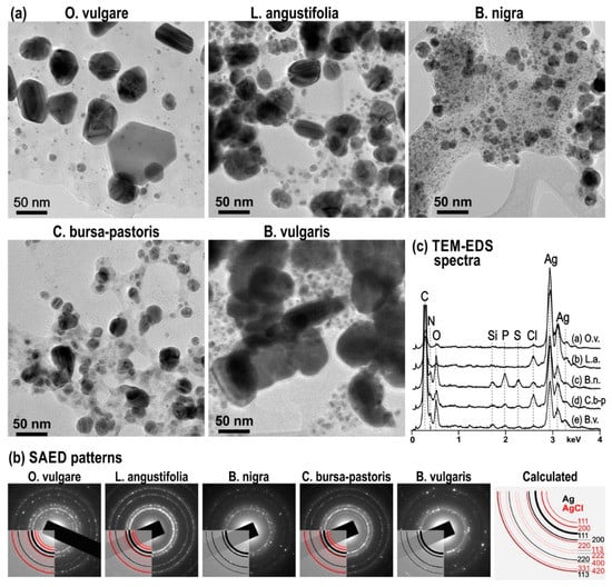TEM analyses in combination with selected area electron diffraction (SAED) confirmed the formation of AgNPs in all samples with the addition of different plant extracts (Figure 2). SAED patterns in the form of diffraction rings confirm that the samples contain randomly oriented particles with sizes in the nanometre range. While the larger NPs contribute to the brighter diffraction dots, the finer ones yield those with lower brightness. A larger number of finer nanoparticles in the area selected for the diffraction analysis results in the formation of continuous rings as observed, e.g., in the sample L. angustifolia in Figure 2b. An additional factor that contributes to the appearance of diffraction pattern is the thickness of the sample; in this case, the organic matrix is quite thick, which weakens the diffraction intensity from smallest NPs. This effect may be observed in the sample synthesised with the addition of B. nigra, where diffuse rings from the organic matrix are present in the background of the diffraction pattern, whereas the diffraction dots from the crystalline sample are less strong. The results of SAED analyses revealed that the samples synthesised in the presence of O. vulgare, L. angustifolia and C. bursa-pastoris contain fine AgCl NPs in addition to elemental Ag. Figure 2b also shows the calculated diffraction of diffraction rings from both phases and the d-values of diffraction rings from different lattice planes of both phases (Ag and AgCl), and their relative intensities are listed in Table 4. The formation of the AgCl phase is related to the presence of Cl in the plant-originated capping agents as revealed by TEM-EDS shown in Figure 2c. EDS analyses reveal that, besides chlorine, the organic matrix of B. nigra, C. bursa-pastoris and B. vulgaris also contains other elements such as sulphur, phosphorous, silicon and nitrogen. The presence of nitrogen might result from incomplete reduction of silver nitrate in the initial solution or their presence in the matrix of these plants.